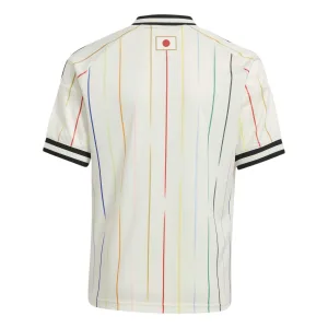 The Japan 2026 away jersey is designed around the concept “Colors Beyond the Horizon.” This theme represents the unity and bond of the nation, illustrated through a stripe graphic featuring 12 different colors. Each of the 11 colors symbolizes a player on the team, while the central red stripe represents the Japanese soccer family. The red stripe’s position at the center of the kit highlights the idea that family is the foundation of the national team. This design not only emphasizes the importance of teamwork and unity but also celebrates the broader community that supports and uplifts the team.